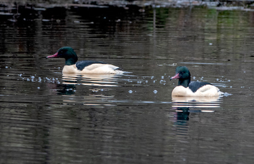 The numbers of birds visiting our feeders outside the cafe is highest in mid winter. Mostly Blue Tit, Great Tit and Coal Tit with gangs of Goldfinches, Long-tailed Tits, as well as Nuthatch and Great-spotted Woodpecker. We have not seen Marsh Tit for a while nor Siskin or Brambling this winter. Away from the feeders there are plenty of Siskins whirling around the trees in the woods and ravens call as they fly over. Snipe have been seen in the meadows and Woodcock flushed occasionally from the woods. There are very few berries around the gardens and reserve now, an influx of Blackbirds having taken all but a few rose hips and hawthorn haws. For a few weeks there were two stunning male Goosanders on Bayfield lake, they moved off when the lake froze over, but at least one has returned.